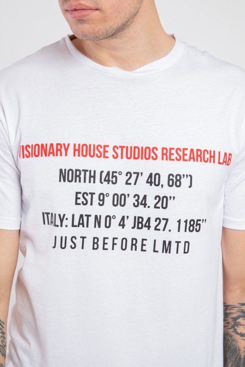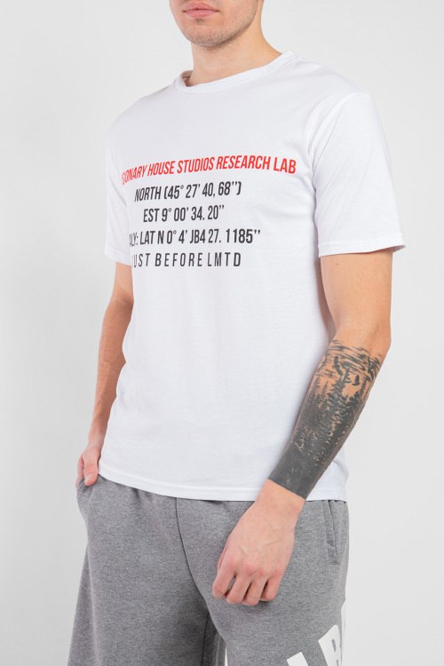 Мужская белая футболка из хлопка от J.B4 Just Before (Джаст Бифо). Классическая длина, круглый вырез горловины, короткие рукава, дизайн с принтом спереди, патч-лого.