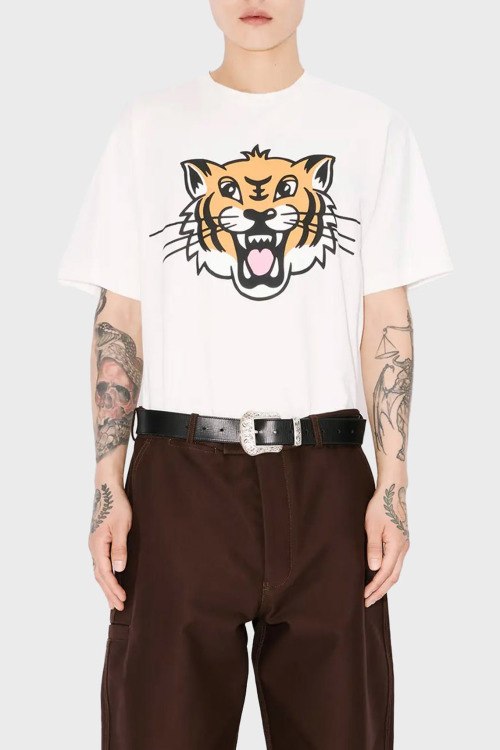 Детали: Женская белая футболка Happy Tiger из хлопка от Kenzo (Кензо). Классическая длина, круглый вырез горловины, короткие рукава, модель декорирована принтом на груди и на спине
