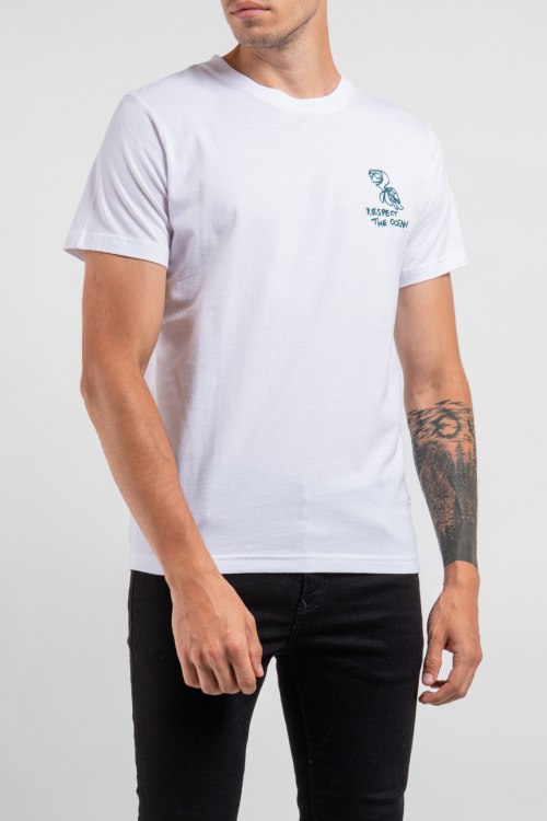 Детали: Мужская белая футболка из хлопка от Ko Samui (Ко Самуи). Классическая длина, круглый вырез горловины, короткие рукава, на груди вышивка Respect зеленого цвета