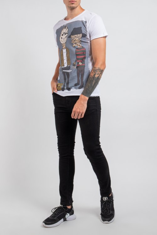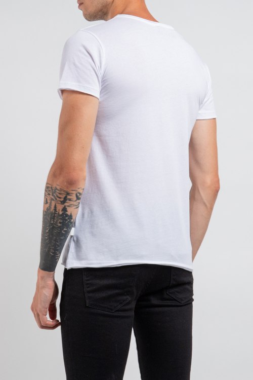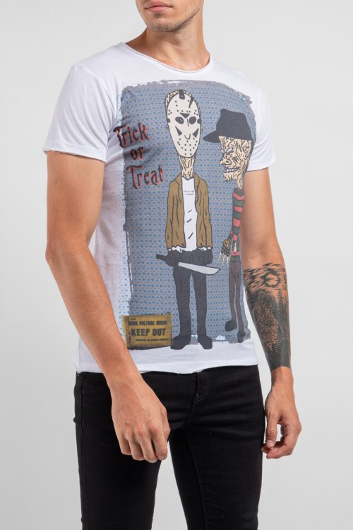 Мужская белая футболка из хлопка от Ko Samui (Ко Самуи). Классическая длина, круглый вырез горловины, короткие рукава, спереди принт Trick.