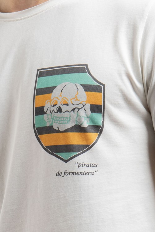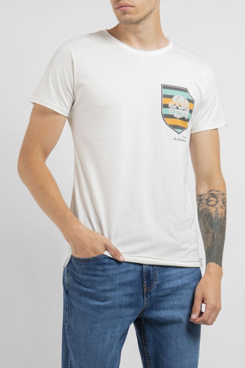 Мужская футболка молочного оттенка из хлопка от Ko Samui (Ко Самуи). Классическая длина, круглый вырез горловины, на груди принт, короткие рукава.