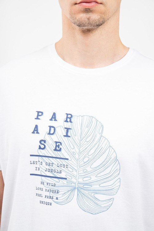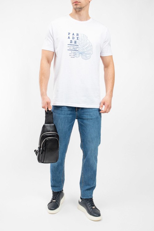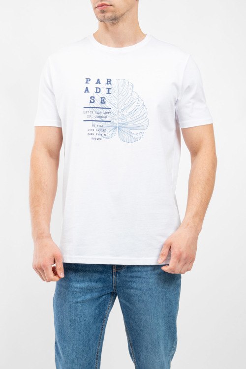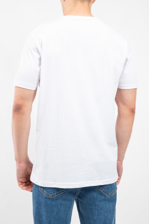 Мужская белая футболка из хлопка от Marvelis (Марвелис). Классическая длина, круглый вырез горловины, короткие рукава, декорирована принтом спереди.