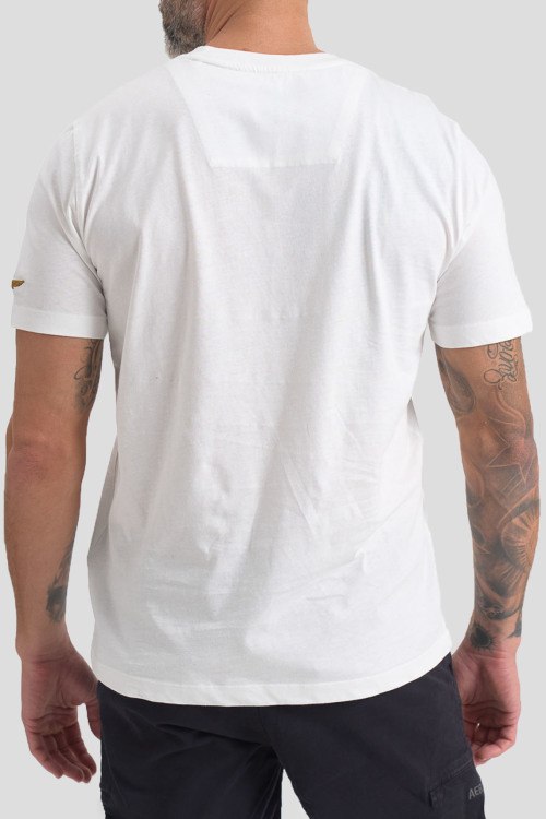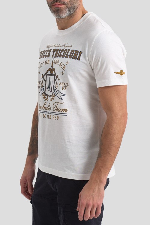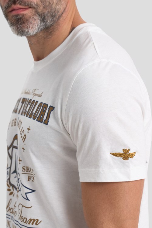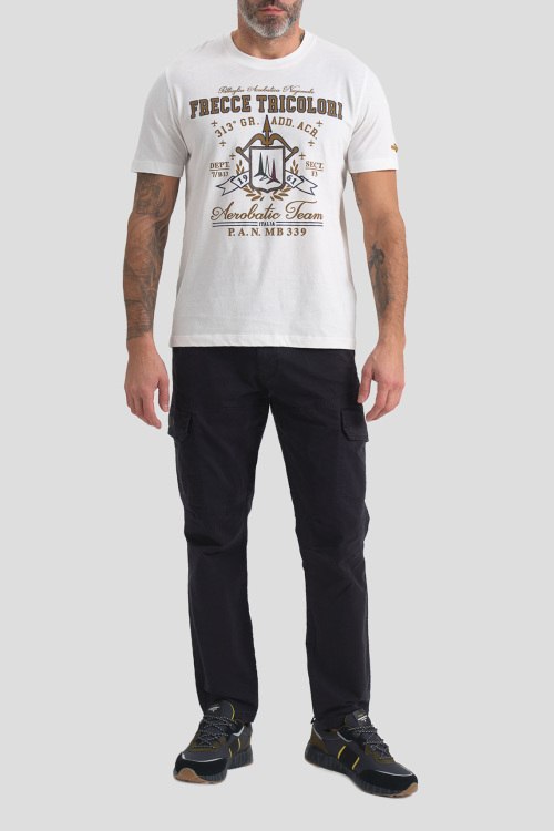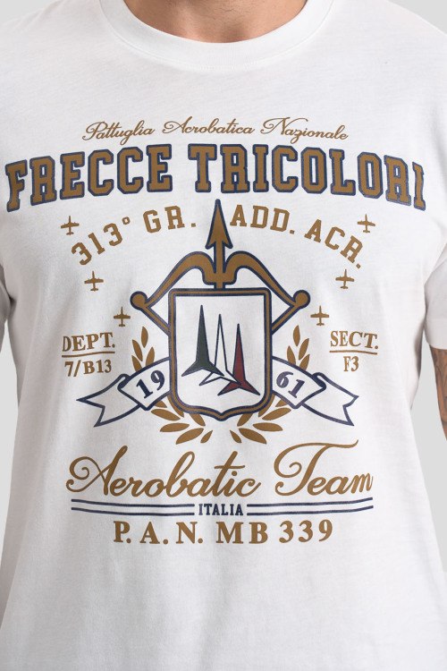 Детали: Мужская белая футболка Frecce Tricolori из хлопка от Aeronautica Militare (Аэронавтика Милитари). Классическая длина, круглый вырез горловины, короткие рукава, модель декорирована брендированным принтом