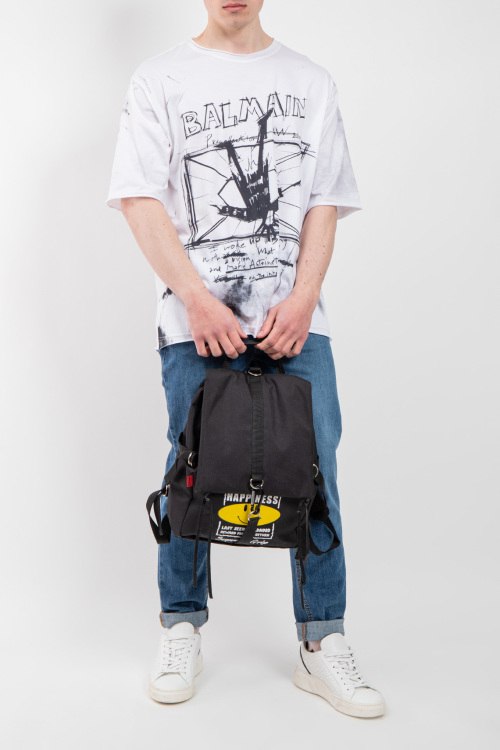Мужская белая футболка из хлопка от Balmain (Бальман). Классическая длина, круглый вырез горловины, короткие рукава, декорирована графическим принтом.