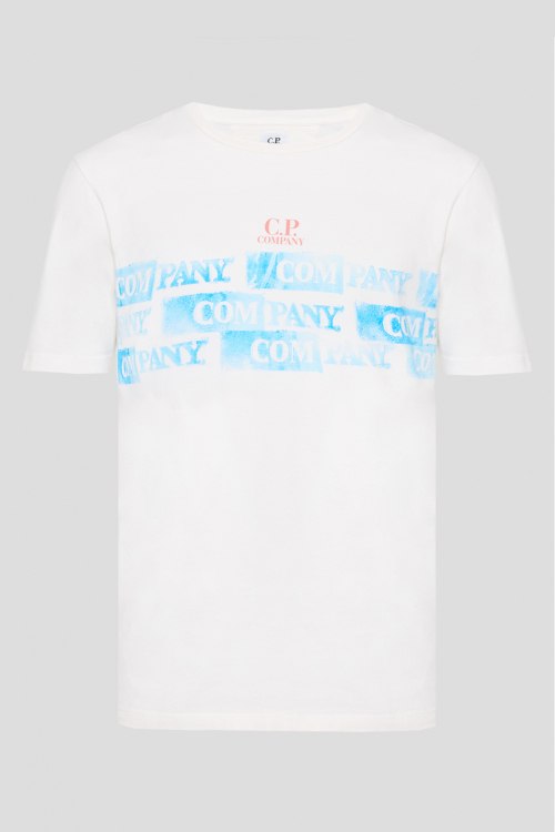 Детали: Мужская белая футболка из хлопка от C.P. Company (СиПи Компани). Классическая длина, круглый вырез горловины, короткие рукава, брендированный принт на груди. Замеры: длина рукава: короткий, для размера М - 24 см, обхват груди: для размера М - 106 см, обхват талии: для размера М - 106 см, длина изделия по среднему шву спинки от горловины: для размера М - 68 см