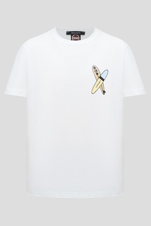 Детали: Мужская белая футболка из хлопка от Colmar (Колмар). Классическая длина, круглый вырез горловины, короткие рукава, модель декорирована принтом. Замеры: длина рукава: короткий, для размера M - 22 см, обхват груди: для размера M - 106 см, обхват талии: для размера M - 100 см, длина изделия по среднему шву спинки от горловины: для размера M - 66 см