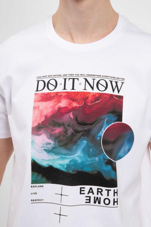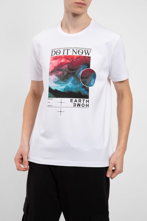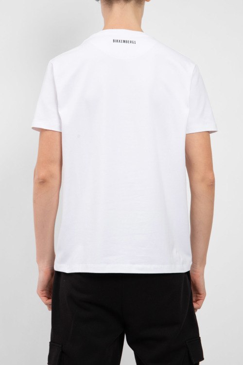Мужская белая футболка из хлопкового микса от Bikkembergs (Биккембергс). Классическая длина, круглый вырез горловины, короткие рукава, модель декорирована ярким принтом.