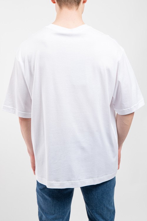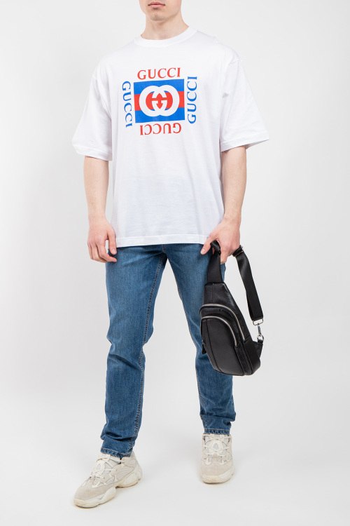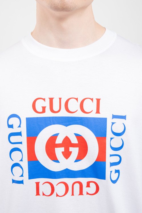 Мужская белая футболка из хлопка от Gucci (Гуччи). Классическая длина, круглый вырез горловины, короткие рукава, брендированный принт на груди.