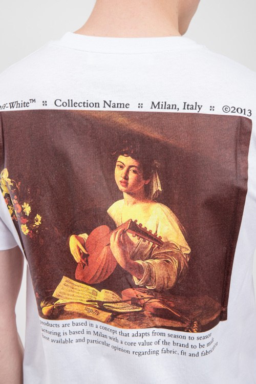 Мужская бежевая футболка из хлопка от Off-White (Офф-Вайт). Классическая длина, круглый вырез горловины, короткие рукава, модель декорирована принтом Caravaggio "The Lute Player" на спине и на груди.