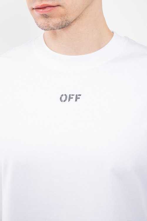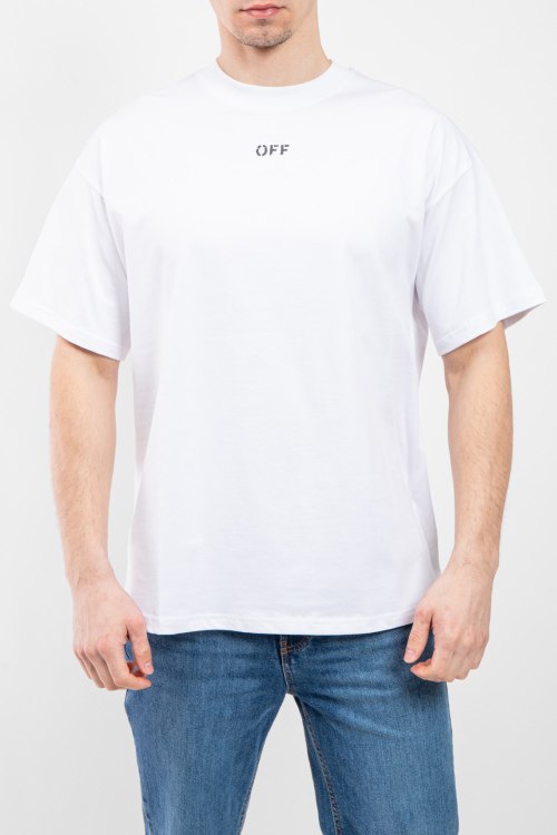 Мужская белая футболка Camiseta из хлопка от Off-White (Офф-Вайт). Классическая длина, круглый вырез горловины, короткие рукава, декорирована принтом на спине, лого на груди.