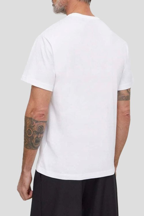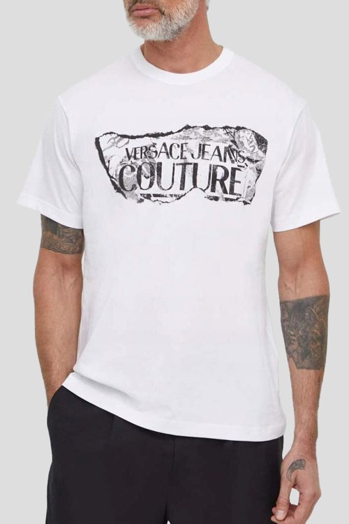 Мужская белая футболка из хлопка от Versace Jeans Couture (Версаче Джинс Кутюр). Классическая длина, круглый вырез горловины, короткие рукава, графический принт с логотипом бренда на груди