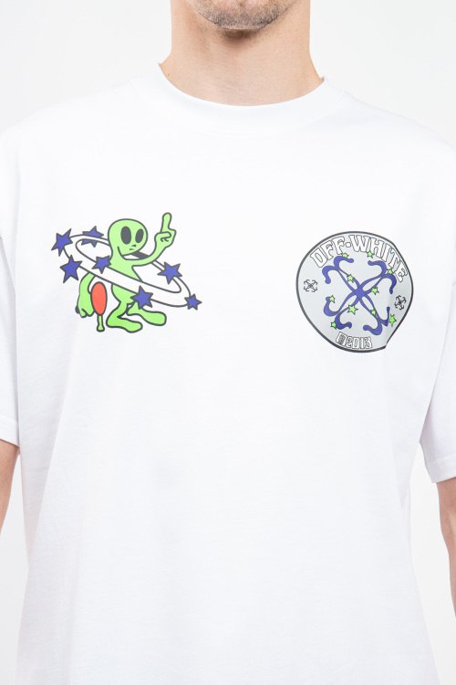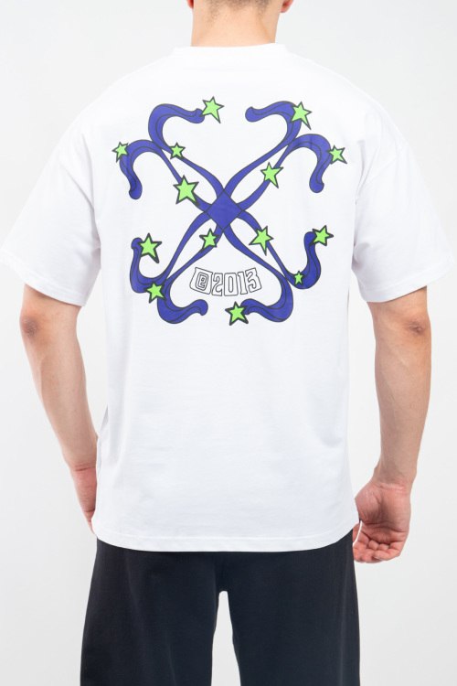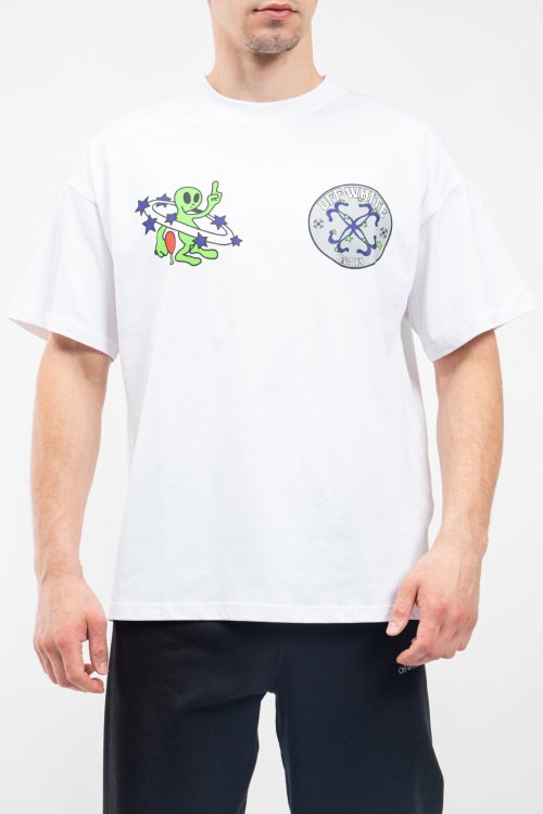 Мужская белая хлопковая футболка от Off-White (Офф-Вайт). Принт на груди и на спине, круглый вырез горловины, короткий рукав, классическая длина.