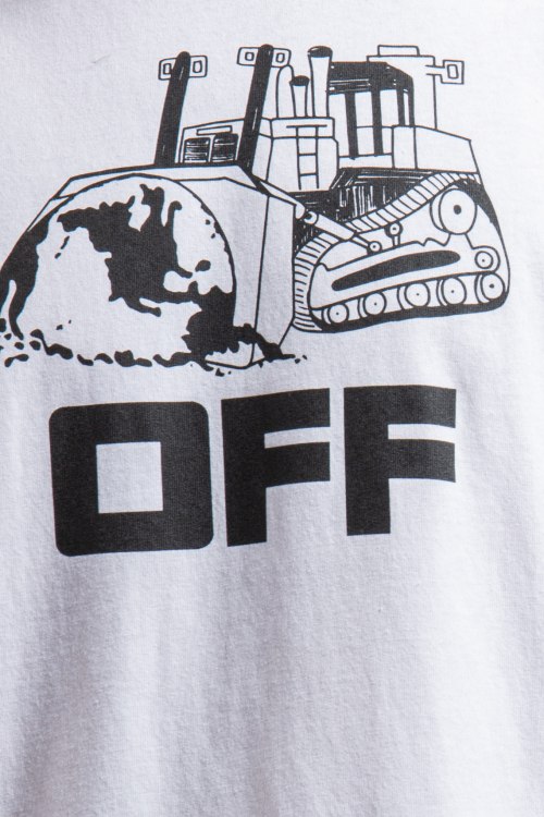 Мужская белая футболка из хлопка от Off-White (Офф-Вайт). Классическая длина, круглый вырез горловины, короткие рукава, ровный низ изделия, спереди и на спине принт с логотипом бренда.