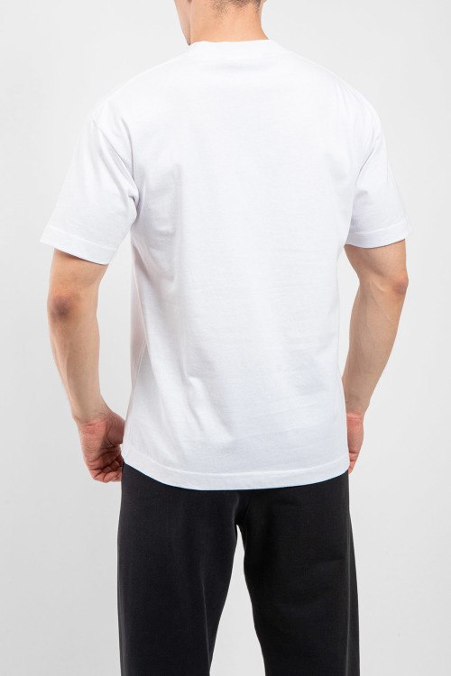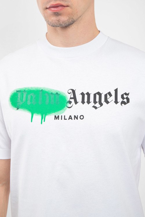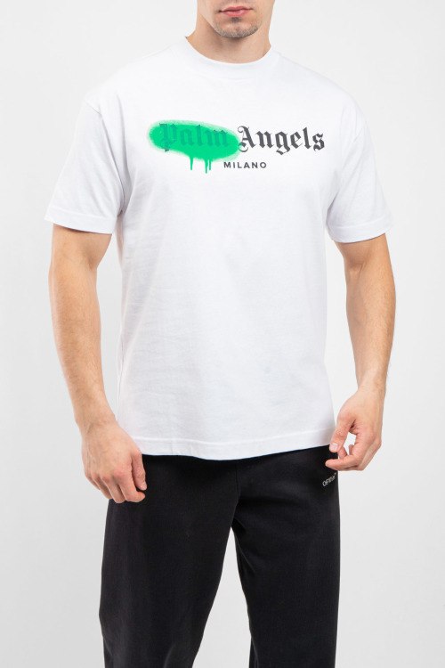 Мужская белая хлопковая футболка от Palm Angels (Палм Энджелс). Принт с логотипом на груди, круглый вырез горловины, короткий рукав.