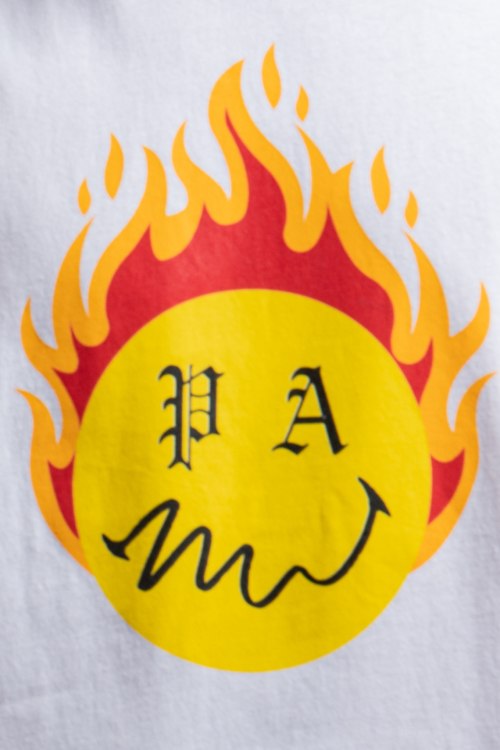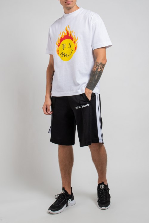Мужская белая хлопковая футболка от Palm Angels (Палм Энджелс). Двухсторонний принт, круглый вырез горловины, короткий рукав