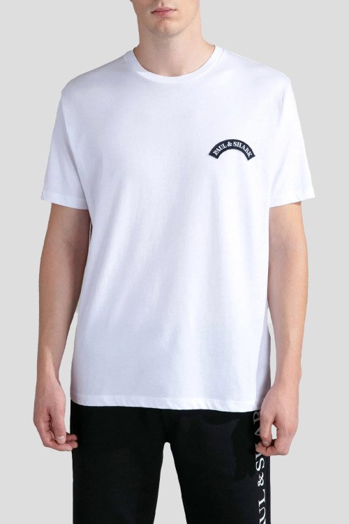 Детали: Мужская белая хлопковая футболка от Paul & Shark (Пол энд Шарк). Нашивка с логотипом на груди, принт на спине, круглый вырез горловины, короткий рукав, классическая длина