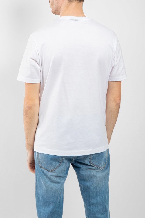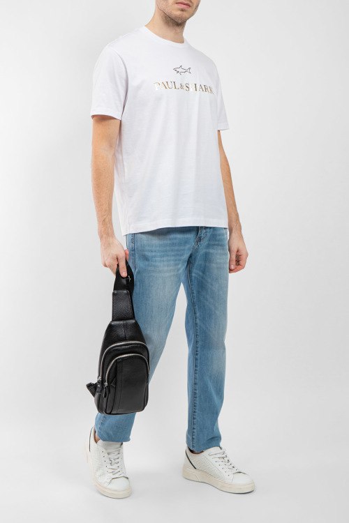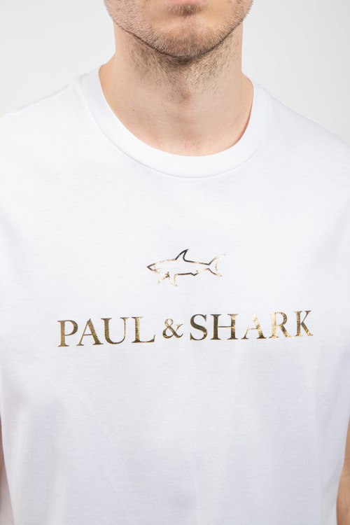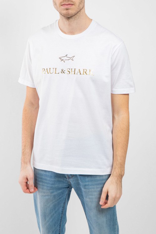Мужская белая футболка из хлопка от Paul & Shark (Пол энд Шарк). Классическая длина, круглый вырез горловины, короткие рукава, брендированный принт на груди.