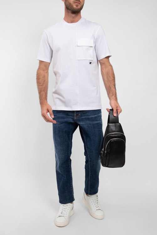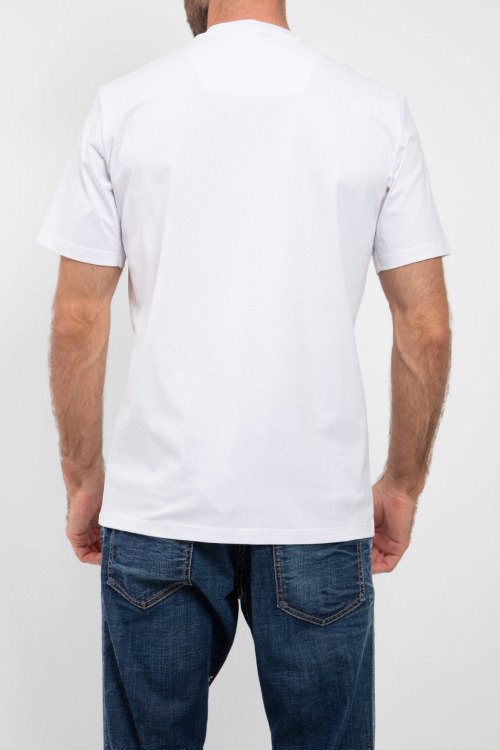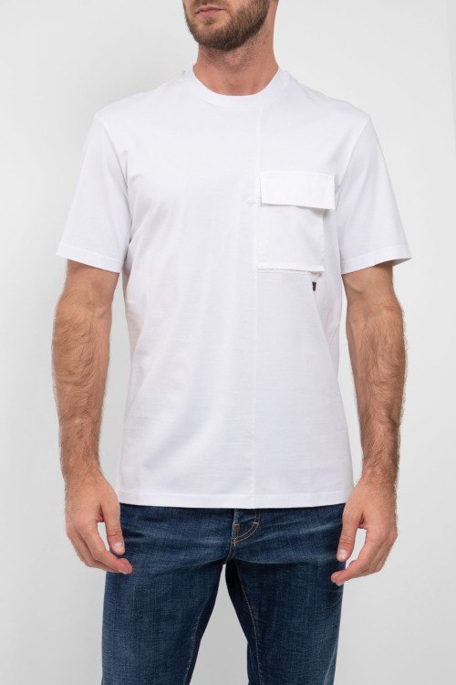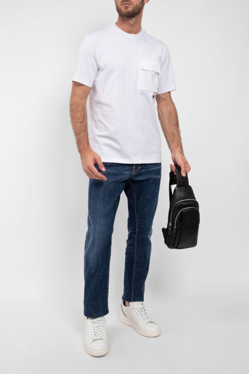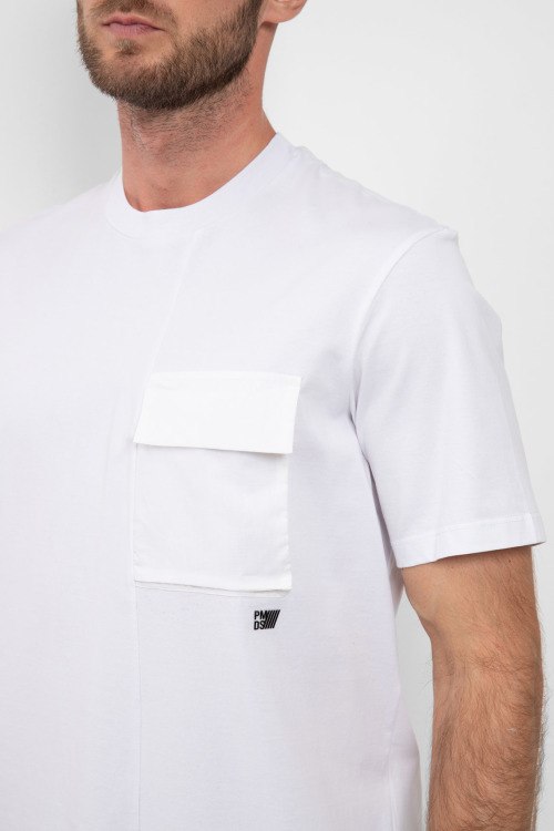 Мужская белая футболка из хлопка от PMDS (ПиЭмДиЭс). Классическая длина, круглый вырез горловины, короткие рукава, нагрудный карман с клапаном, ровный низ изделия.