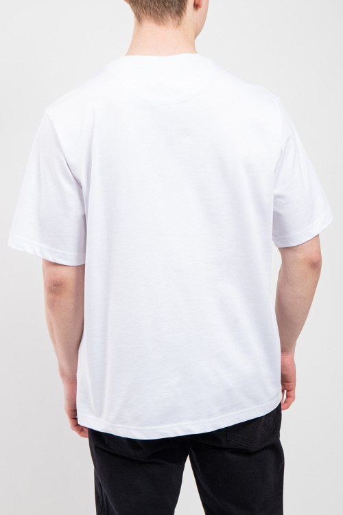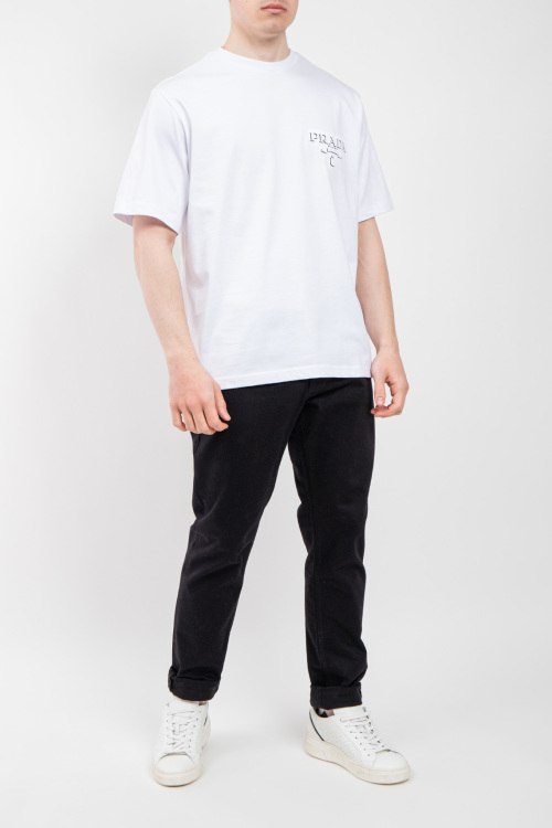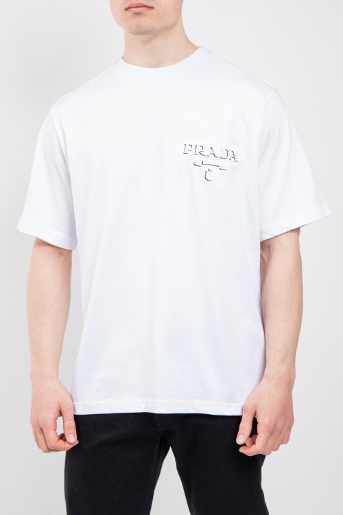 Мужская белая футболка из хлопка от Prada (Прада). Классическая длина, круглый вырез горловины, короткие рукава, брендированный принт на груди.
