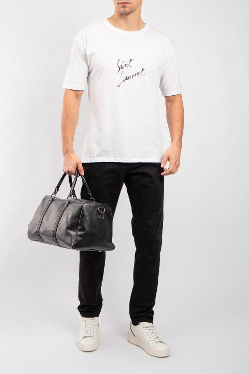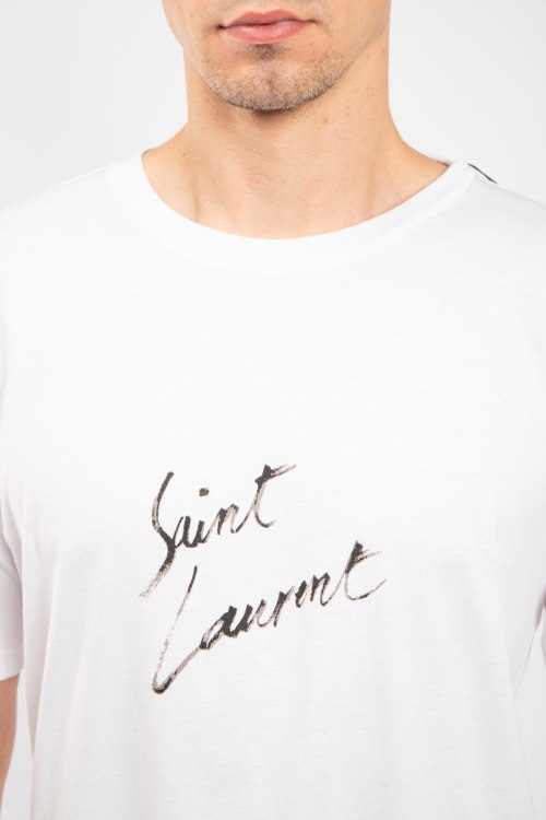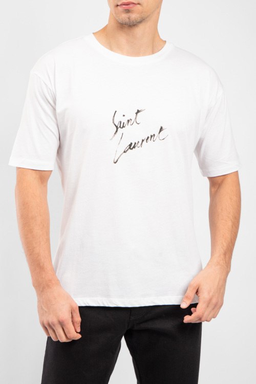 Мужская белая хлопковая футболка от Yves Saint Laurent (Сен Лоран). Логотип на груди, круглый вырез горловины, короткий рукав, классическая длина.