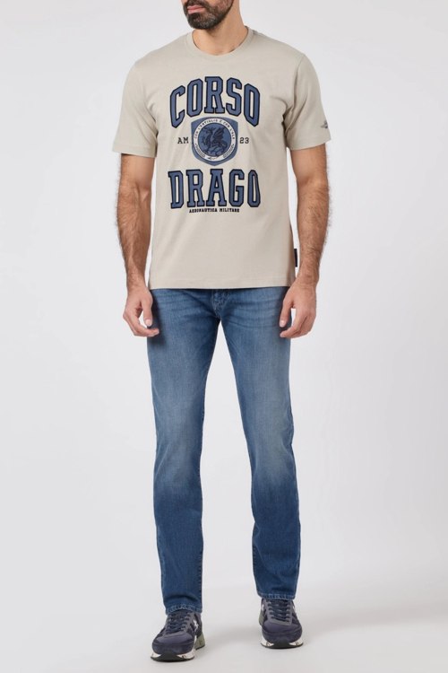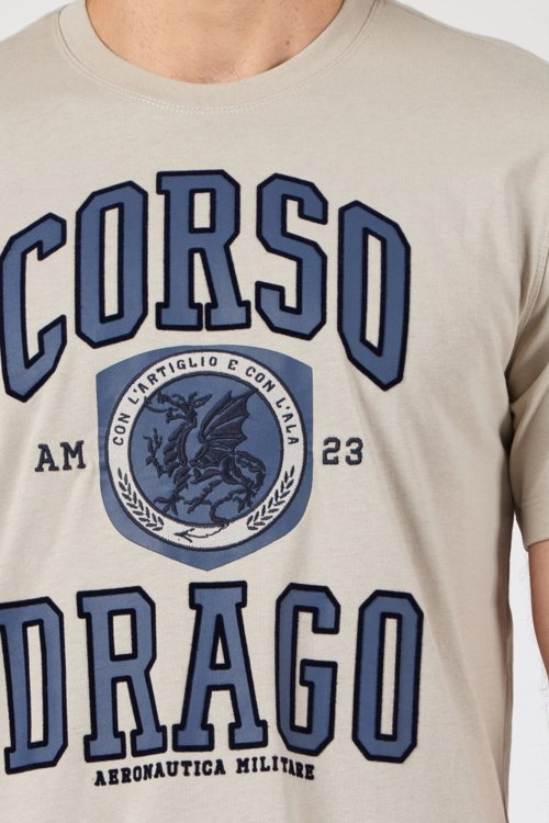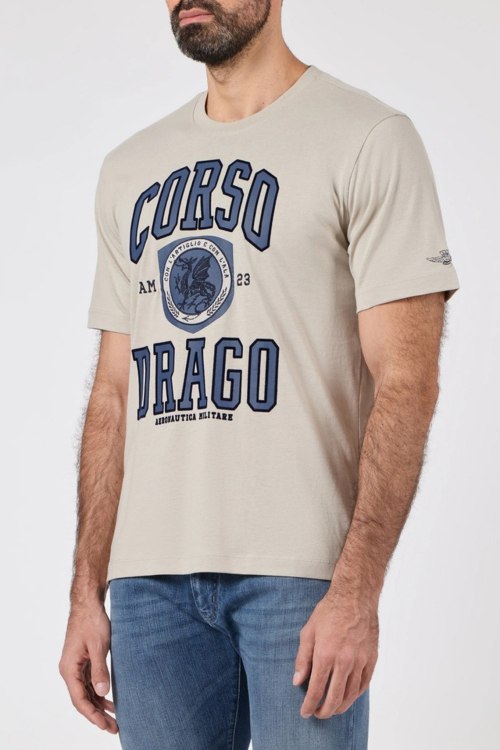 Детали: Мужская бежевая хлопковая футболка от Aeronautica Militare (Аэронавтика Милитари). Принт на груди, круглый вырез горловины, короткий рукав, классическая длина