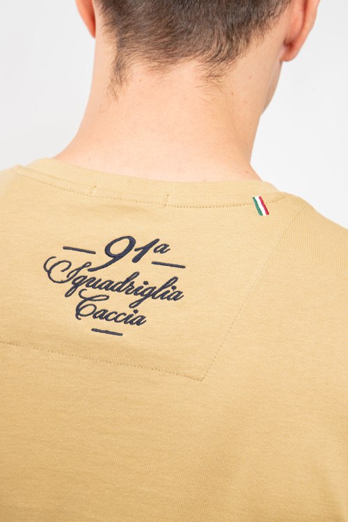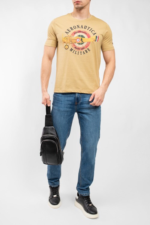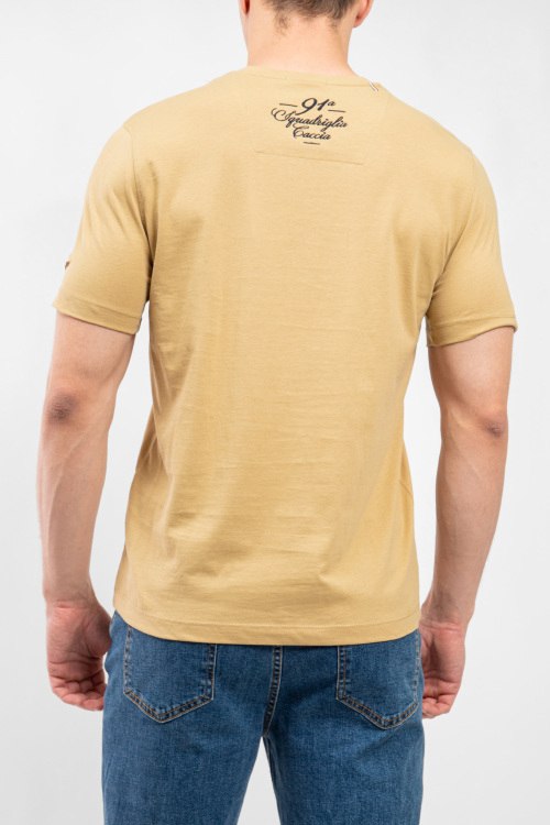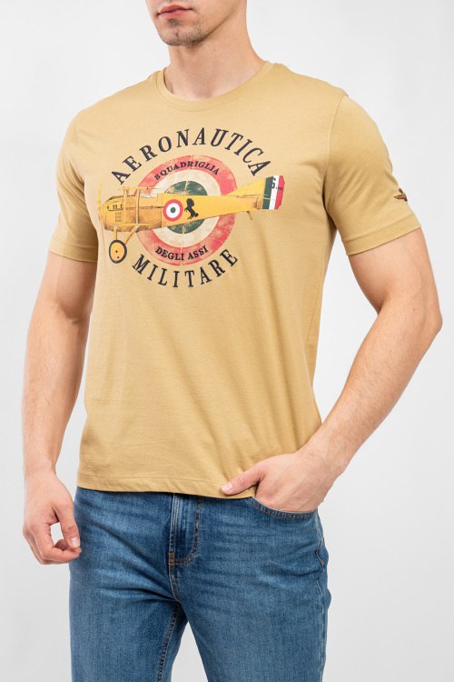 Мужская бежевая хлопковая футболка от Aeronautica Militare (Аэронавтика Милитари). Принт на груди, круглый вырез горловины, короткий рукав, классическая длина.