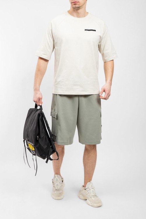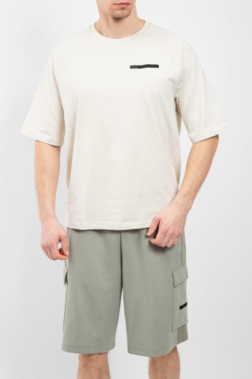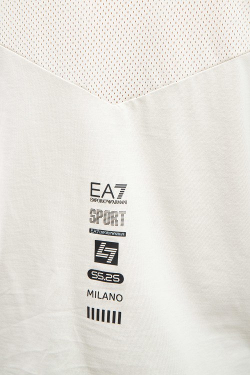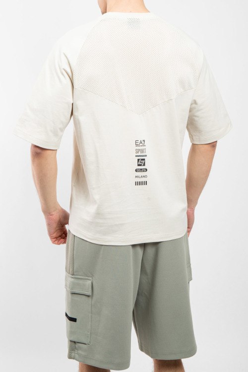 Мужская бежевая футболка из хлопка от EA7 Emporio Armani (ЕА7 Эмпорио Армани). Классическая длина, круглый вырез горловины, короткие рукава, перфорированная вставка, логотип бренда.