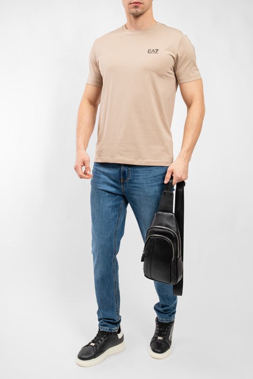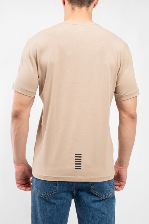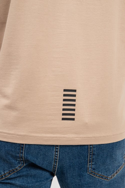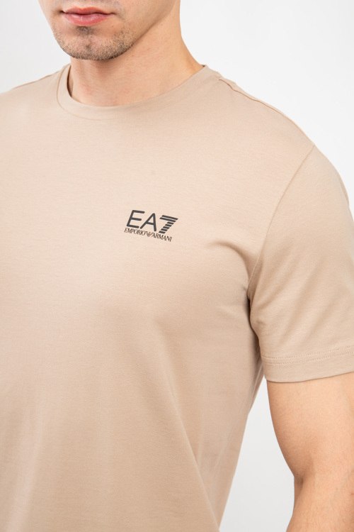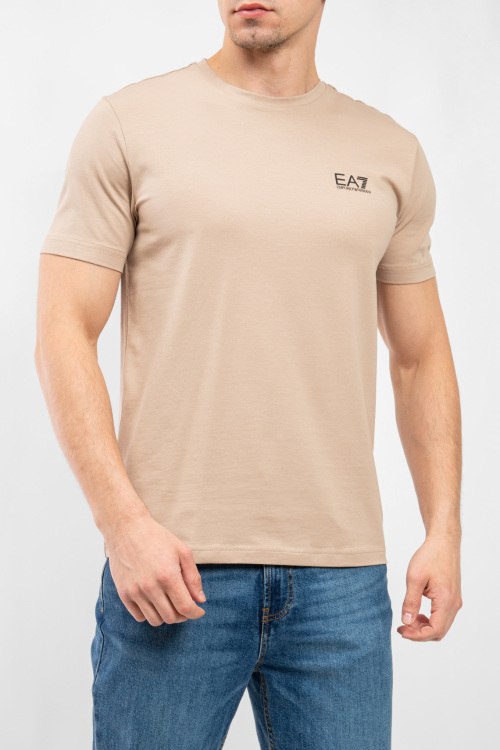 Мужская бежевая хлопковая футболка от EA7 Emporio Armani (ЕА7 Эмпорио Армани). Логотип на груди, круглый вырез горловины, короткий рукав, классическая длина.