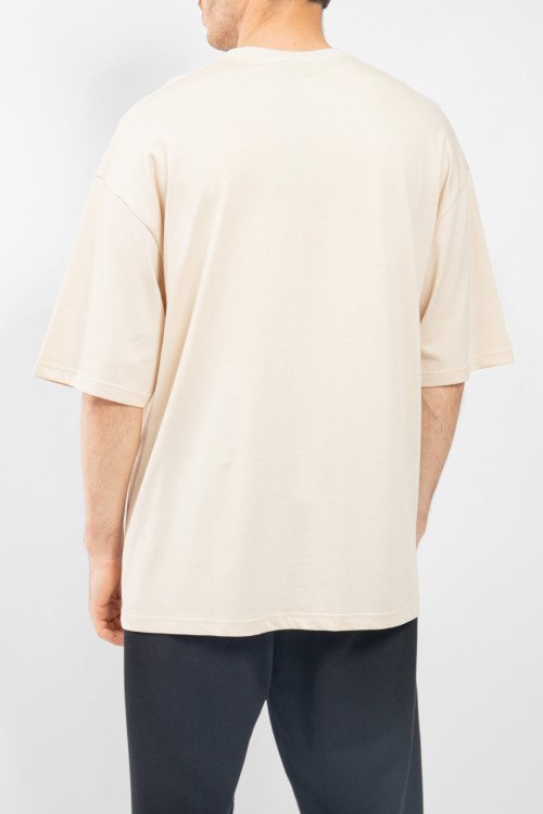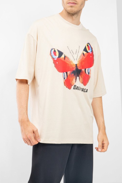 Мужская светло-бежевая хлопковая футболка от Balenciaga (Баленсиага). Принт Butterfly на груди, круглый вырез горловины, короткий рукав, классическая длина.