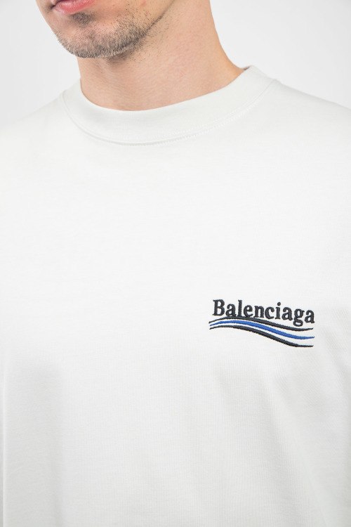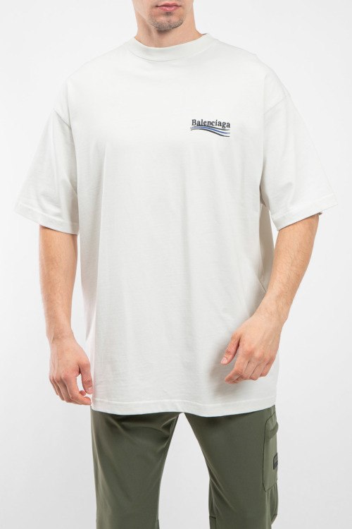 Мужская хлопковая футболка от Balenciaga (Баленсиага). Двухсторонний принт с логотипом, круглый вырез горловины, короткий рукав.