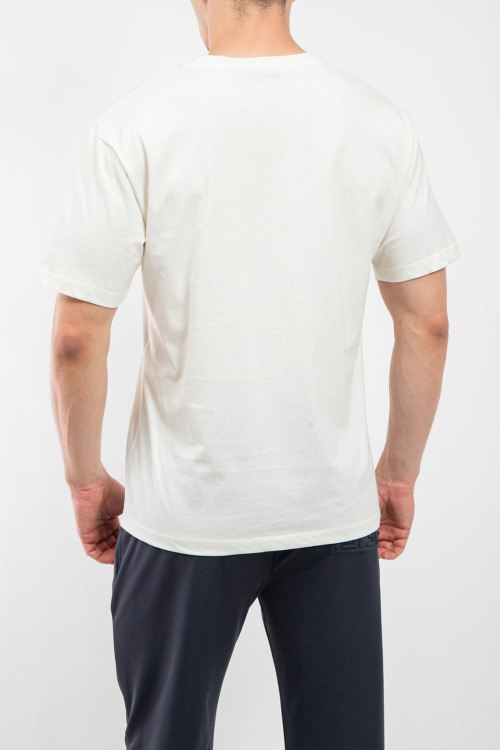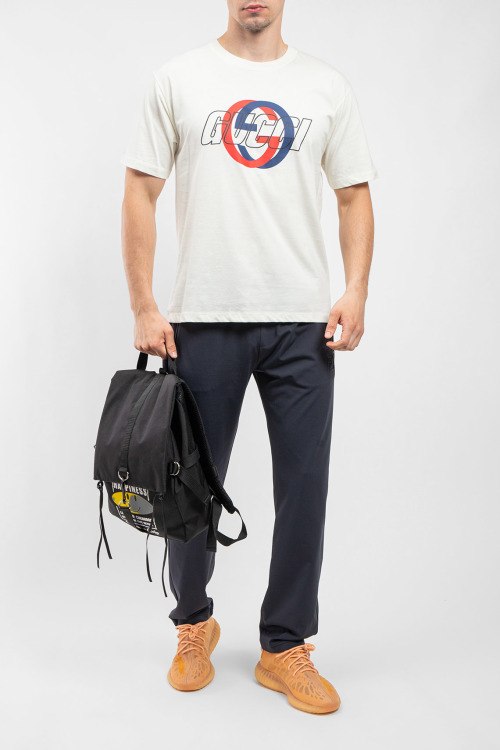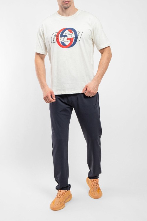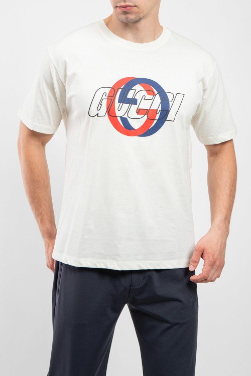 Мужская бежевая футболка из хлопка от Gucci (Гуччи). Круглый вырез горловины, короткие рукава, брендированный принт на груди. Замеры для размера: M; длина - 65 см; ПОГ - 52 см; ПОТ - 51,5 см; ПОБ - 51,5 см; длина по внутреннему шву рукава - 11 см; ширина рукава - 22 см.