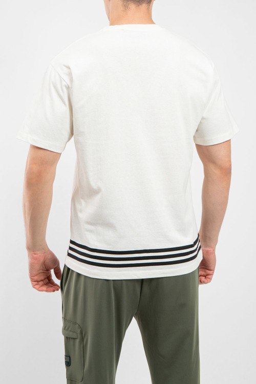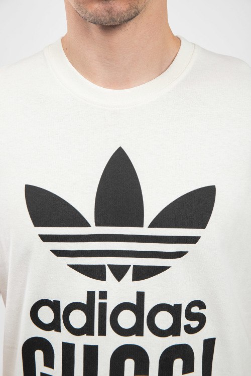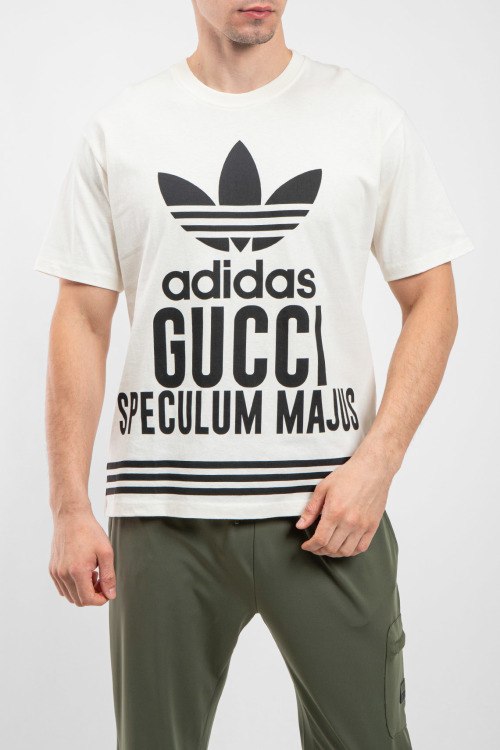 Мужская бежевая футболка из хлопка от Gucci (Гуччи). Модель из коллаборации Gucci X Adidas, дизайн с принтом, логотип бренда, круглый вырез горловины, короткие рукава. На модели снят размер - М.