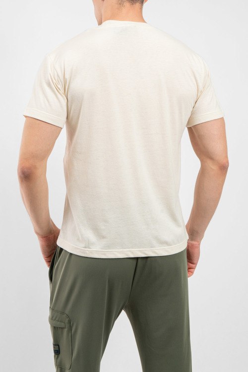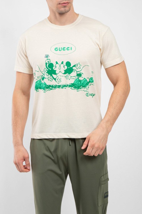 Мужская бежевая футболка из хлопка от Gucci (Гуччи). Удлиненная модель oversize, короткие рукава, круглый вырез под горло, ровный низ изделия, декор: принт с фирменным логотипом бренда на груди. Размер вещи на фото: S/ Замеры для размера: M; длина - 69 см; ПОГ - 56,5 см; ПОТ - 55 см; ПОБ - 55 см; длина по внутреннему шву рукава - 10 см; ширина рукава - 23 см.