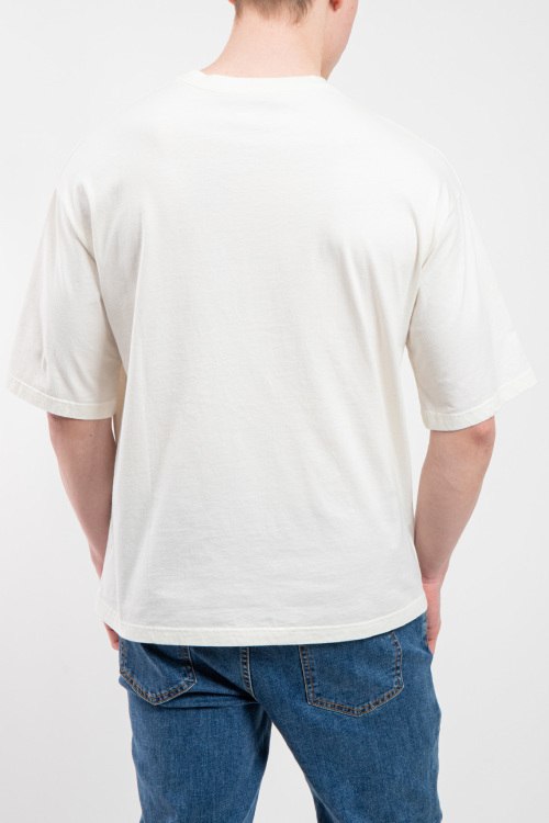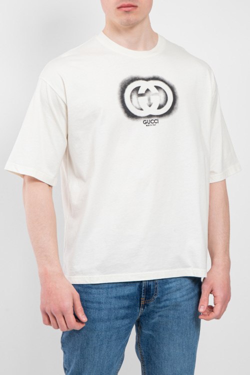 Мужская бежевая футболка из хлопка от Gucci (Гуччи). Классическая длина, круглый вырез горловины, короткие рукава, модель декорирована принтом с логотипом бренда.