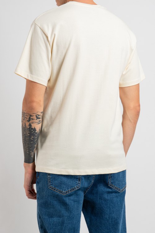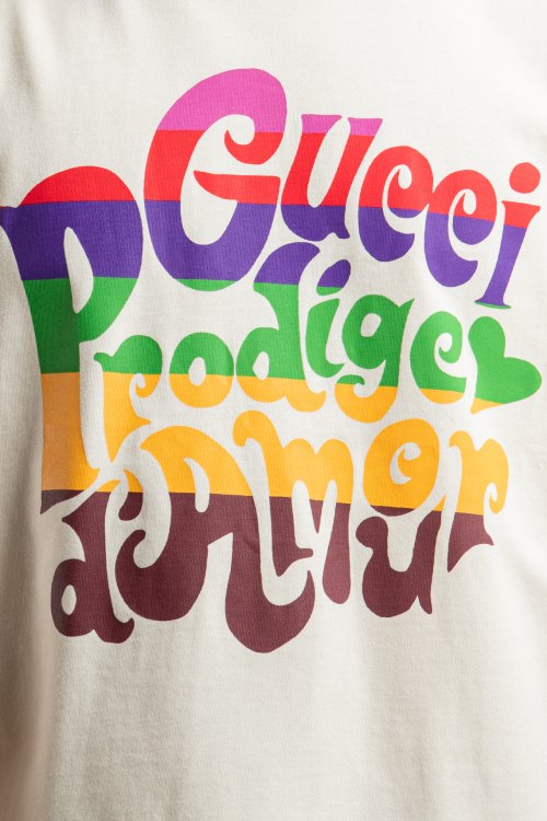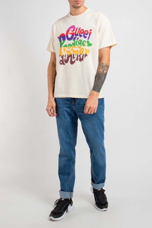 Детали: Мужская бежевая хлопковая футболка от Gucci (Гуччи). Принт с логотипом спереди, круглый вырез горловины, короткий рукав