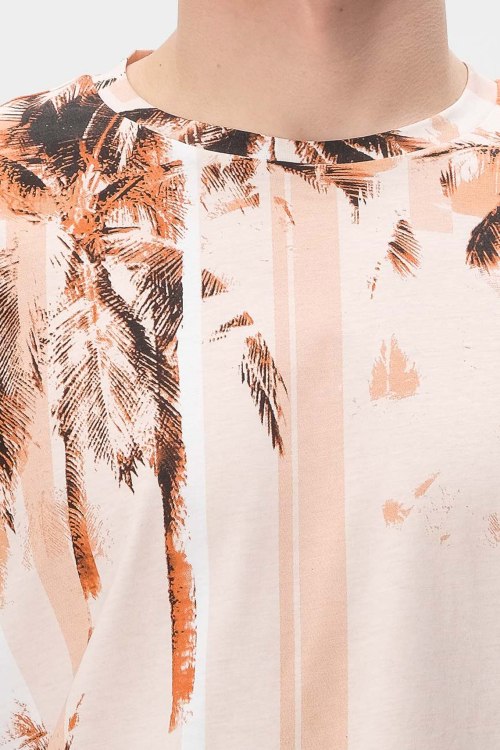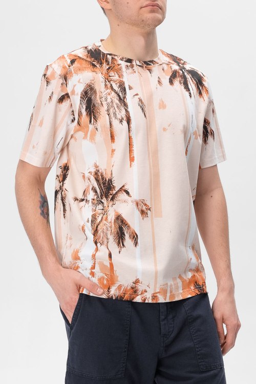 Детали: Мужская бежевая хлопковая футболка от Hugo Boss (Хуго Босс). Принт с пальмами, круглый вырез горловины, короткий рукав, классическая длина