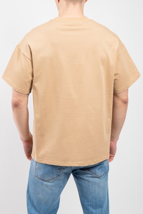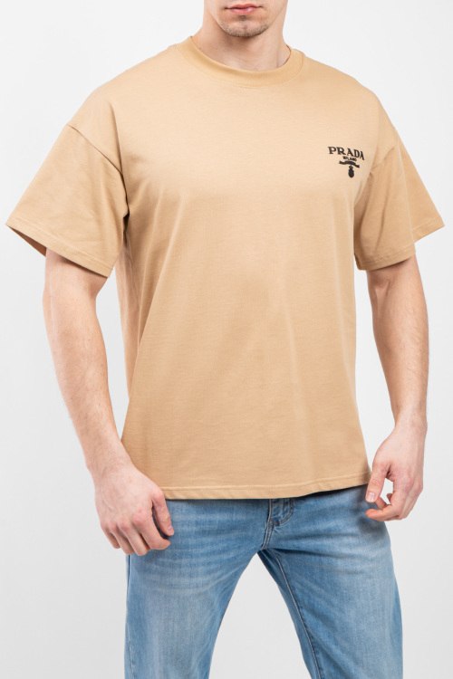 Мужская бежевая футболка из хлопка от Prada (Прада). Классическая длина, круглый вырез горловины, короткие рукава, вышитый логотип бренда на груди.