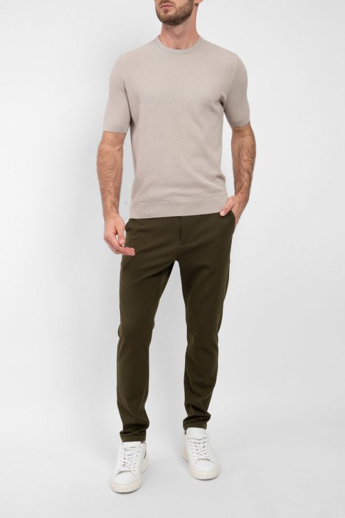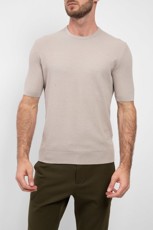 Мужская бежевая футболка из микса хлопка и шелка от Scabal (Скабал). Классическая длина, круглый вырез горловины, короткие рукава, трикотажная резинка по низу изделия, вышитый логотип бренда.