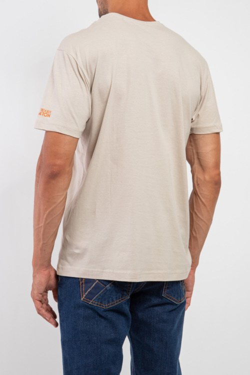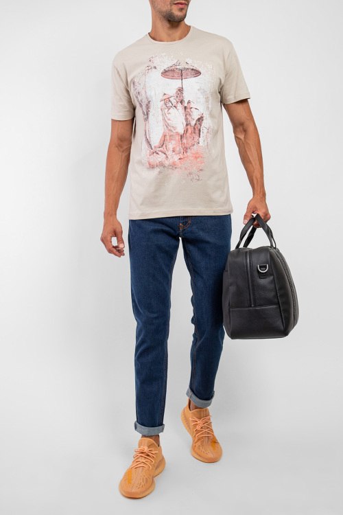 Мужская бежевая хлопковая футболка от Trussardi (Труссарди). Принт спереди, круглый вырез горловины, короткий рукав, классическая длина.