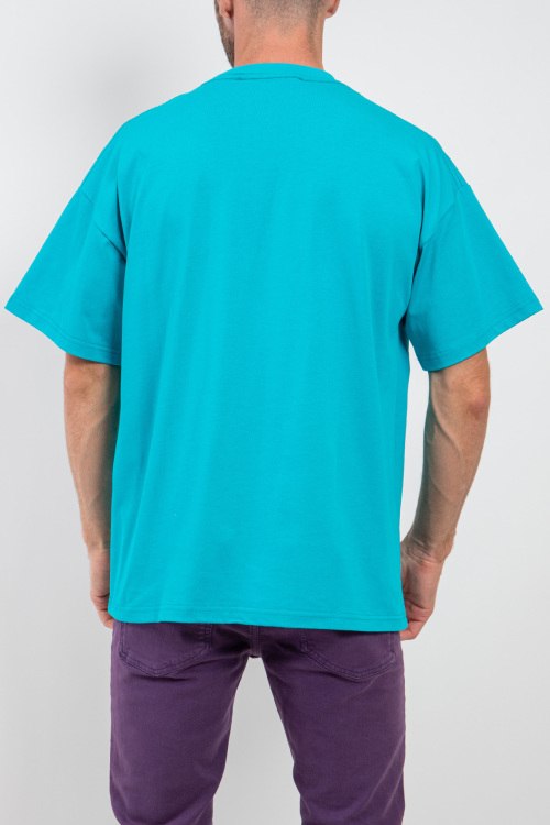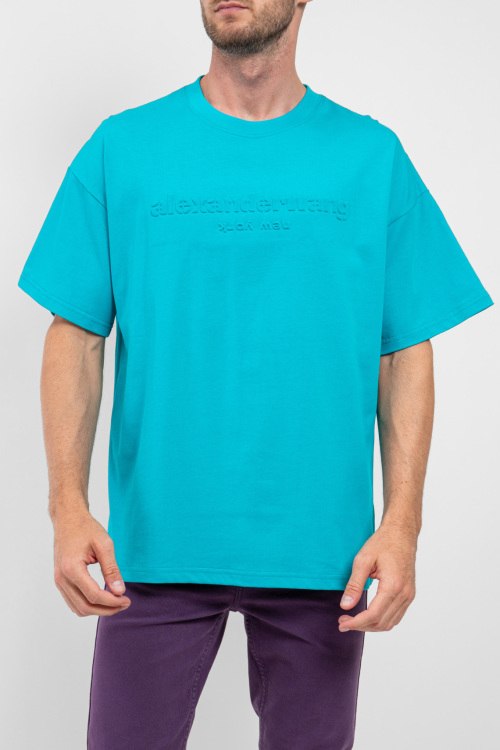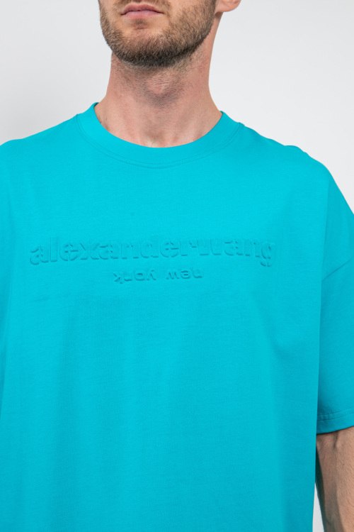 Детали: Мужская бирюзовая хлопковая футболка от Alexander Wang (Александр Ванг). Фасон oversize, тиснение логотипа на груди, круглый вырез горловины, короткий рукав, классическая длина