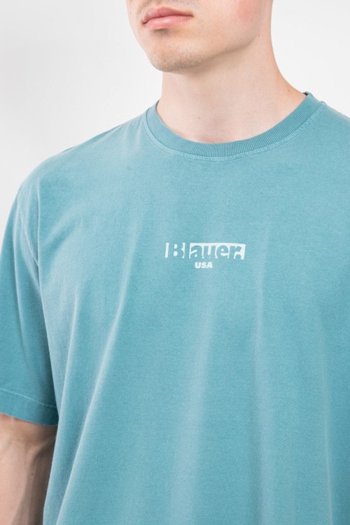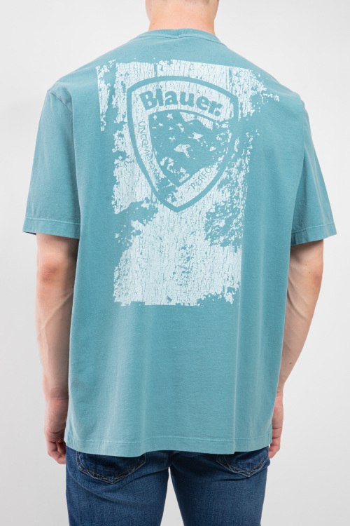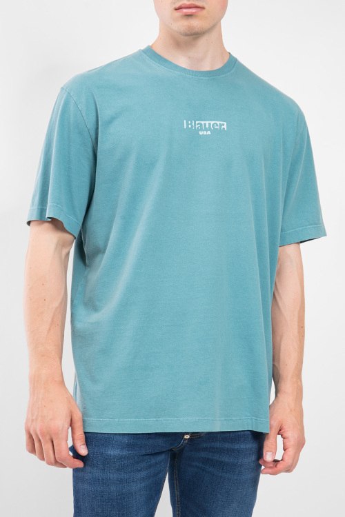 Детали: Мужская бирюзовая хлопковая футболка от Blauer (Блауэр). Принт с логотипом на груди и на спине, круглый вырез горловины, короткий рукав, классическая длина