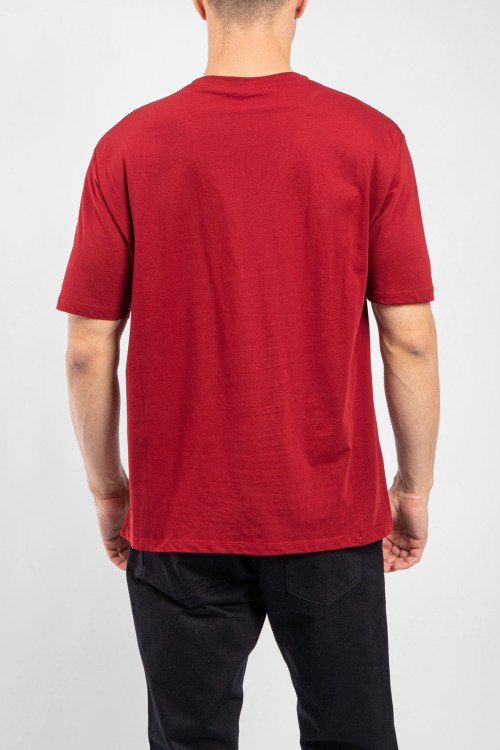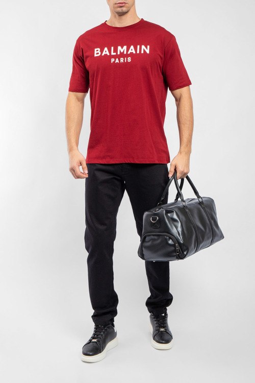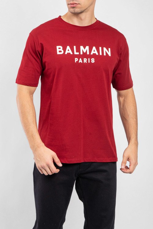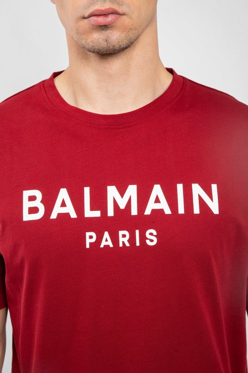 Мужская бордовая хлопковая футболка от Balmain (Бальман). Принт с логотипом на груди, круглый вырез горловины, короткий рукав, классическая длина.