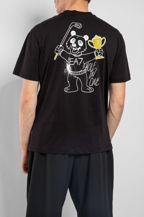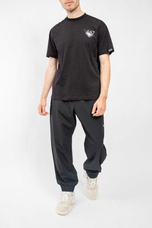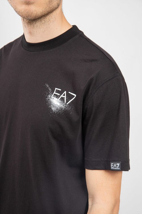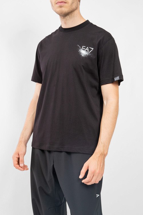 Мужская черная футболка из хлопка от EA7 Emporio Armani (ЕА7 Эмпорио Армани). Классическая длина, круглый вырез горловины, короткие рукава, логотип на груди, принт на спине.