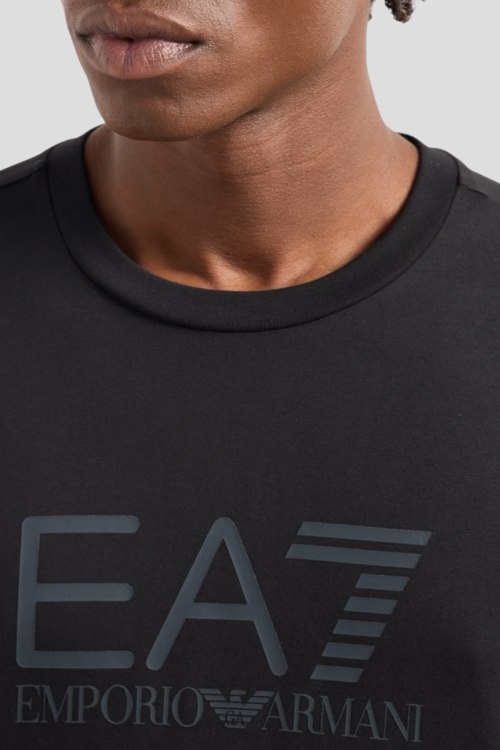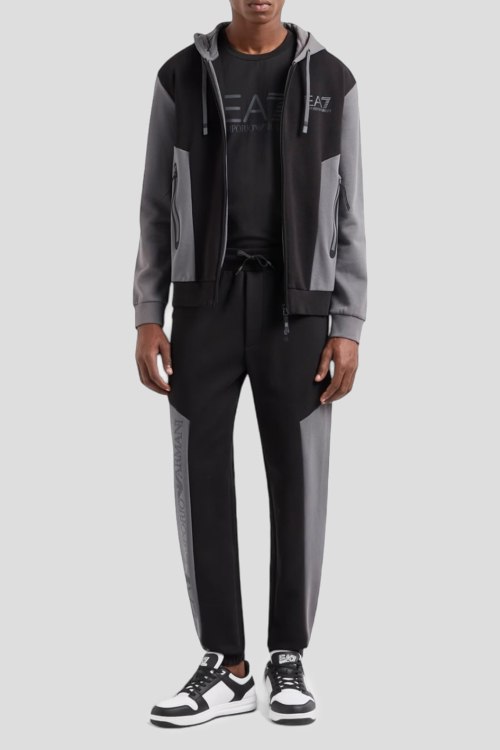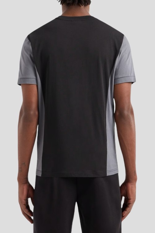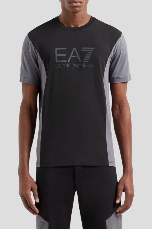 Детали: Мужская черно-серая хлопковая футболка Athletic Colour Block от EA7 Emporio Armani (ЕА7 Эмпорио Армани). Комбинация материалов, круглый вырез горловины, короткие рукава, брендированный принт на груди