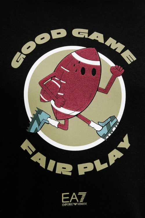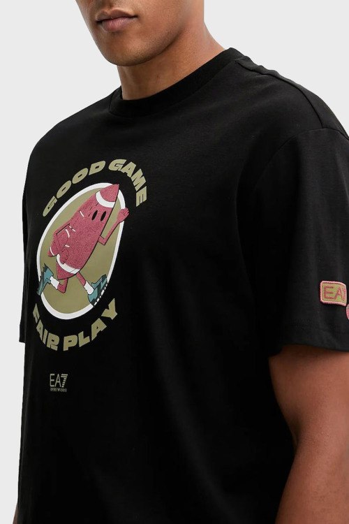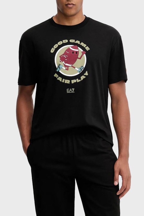 Детали: Мужская черная хлопковая футболка от EA7 Emporio Armani (ЕА7 Эмпорио Армани). Принт на груди, круглый вырез горловины, короткий рукав, классическая длина