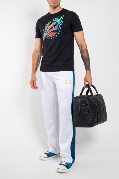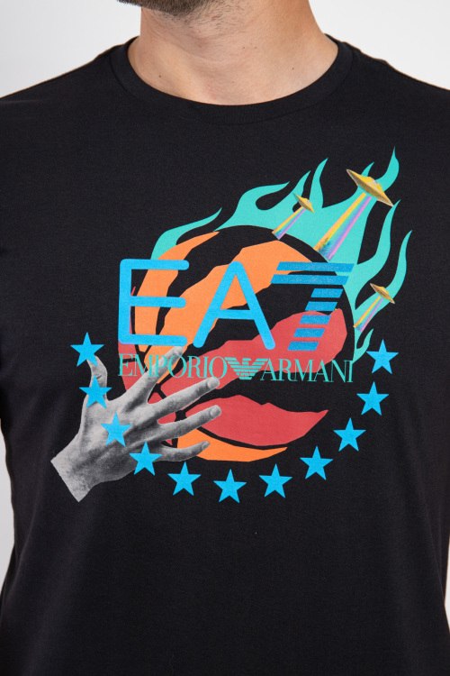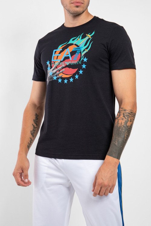 Мужская черная хлопковая футболка от EA7 Emporio Armani (ЕА7 Эмпорио Армани). Принт с логотипом спереди, круглый вырез горловины, короткий рукав, классическая длина.