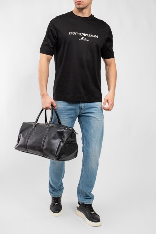Мужская черная футболка из лиоцелла и хлопка от Emporio Armani (Эмпорио Армани). Логотип на груди, круглый вырез горловины, короткий рукав, классическая длина.