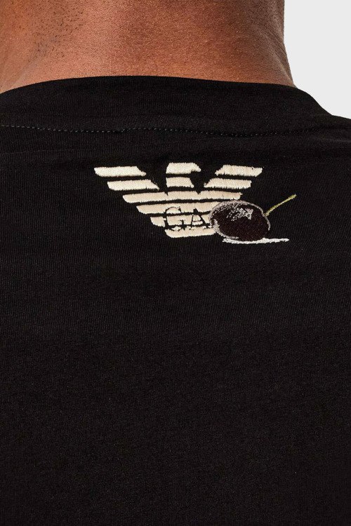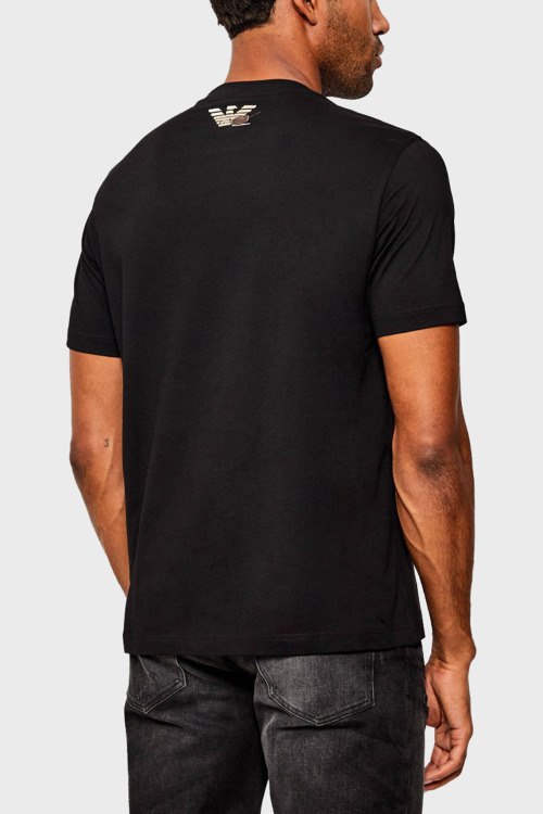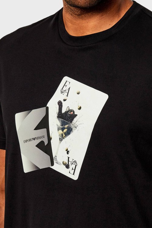 Детали: Мужская черная хлопковая футболка от Emporio Armani (Эмпорио Армани). Карточный принт на груди, круглый вырез горловины, короткий рукав, классическая длина
