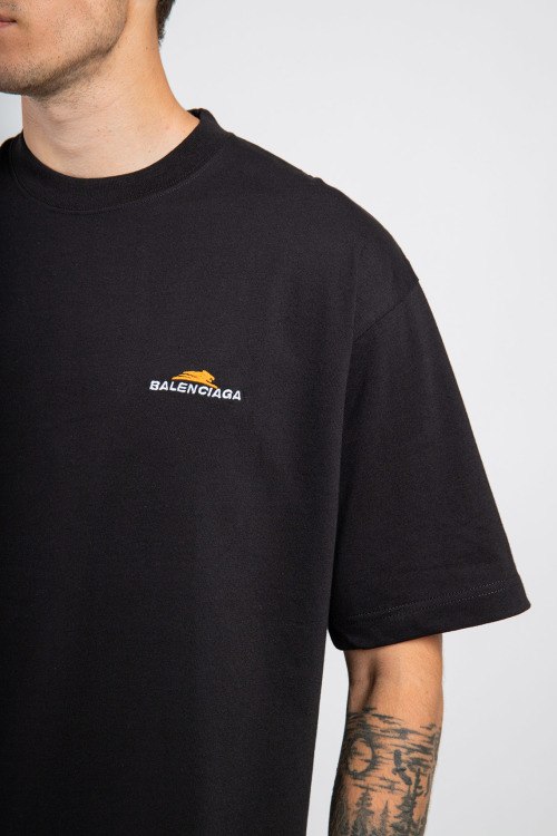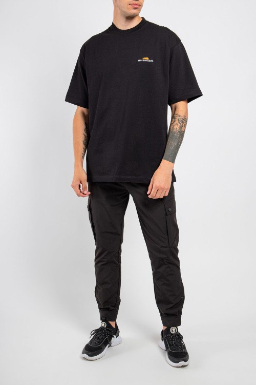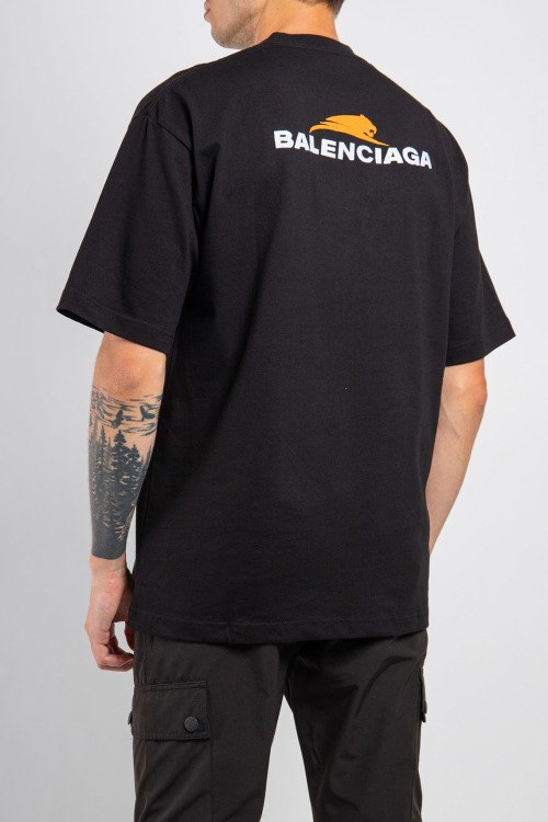 Мужская черная футболка из хлопка от Balenciaga (Баленсиага). Классическая длина, короткие рукава, круглый вырез горловины, ровный низ изделия, декор: принт с логотипом бренда на груди