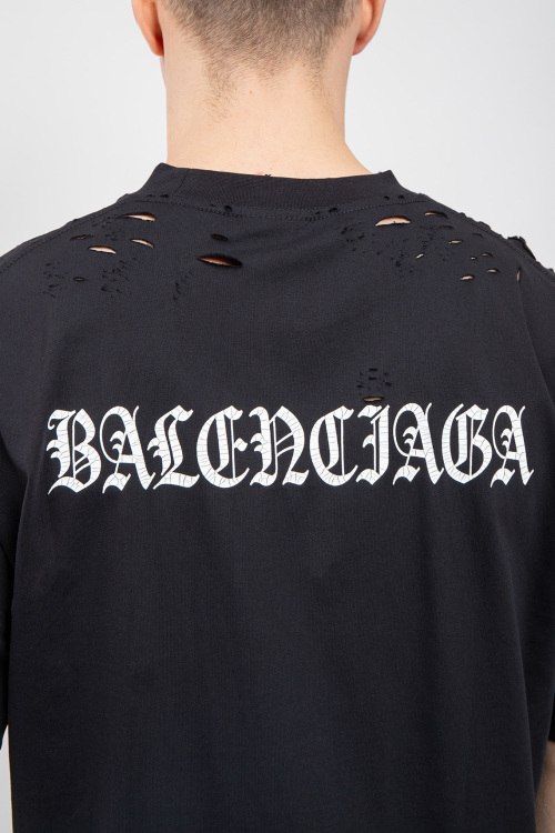 Мужская черная футболка из хлопка от Balenciaga (Баленсиага). Классическая длина, круглый вырез горловины, короткие рукава, рванные детали, брендированный принт на спине.
